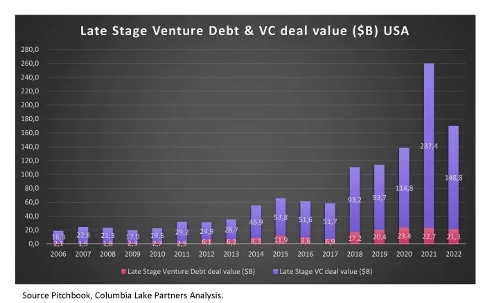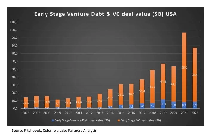 Our analysis indicates to us that, at the moment, this is not the case. We find that the use of debt by companies has been consistent over several years, in both the Early and Late Stages. From 2019 to 2022, the total of early and later-stage debt funding was approximately $31 billion per year.