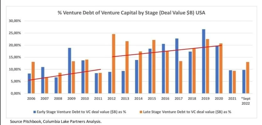 Whilst the data shows us that equity markets retreated in 2022 compared to 2021 and that the use of debt as a percentage of venture capital funding increased, we ask: